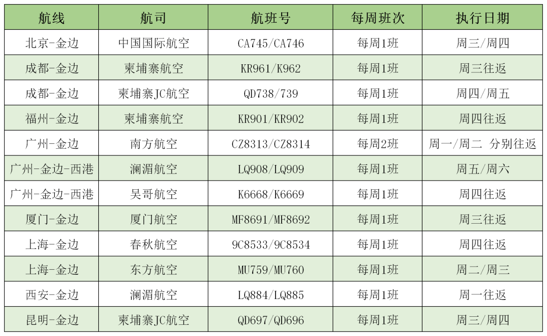 2020年9月中国-柬埔寨金边航班计划